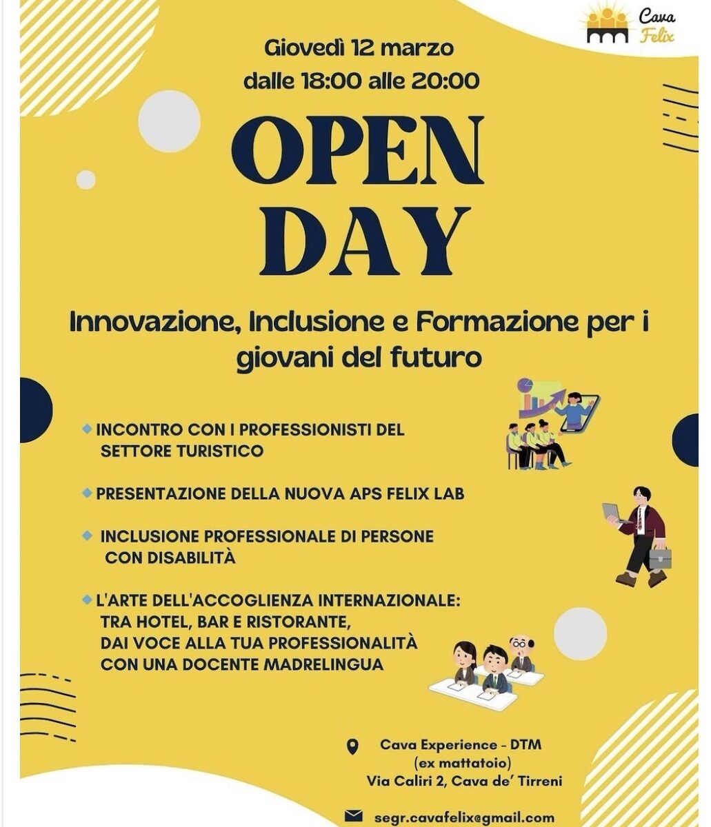 Un pomeriggio dedicato all’orientamento, alla formazione e alle nuove opportunità nel settore turistico. Giovedì 12 marzo, dalle 18:00 alle 20:00, l’associazione Cava Felix organizza un Open Day presso Cava Experience – DTM, in via Caliri 2 (ex mattatoio), a Cava de’ Tirreni.